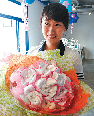 毛巾咖啡館有上千種造型毛巾,栩栩如生的花束是傳情最好禮物,很受情侶青睞。記者蔡維斌/攝影 |